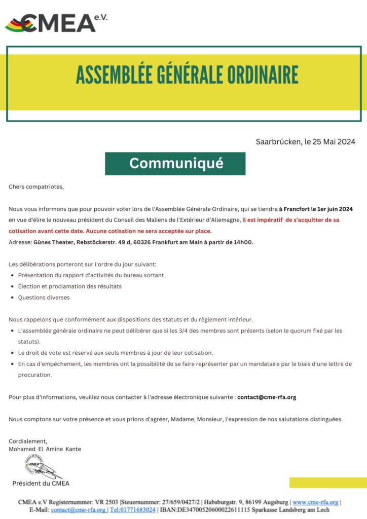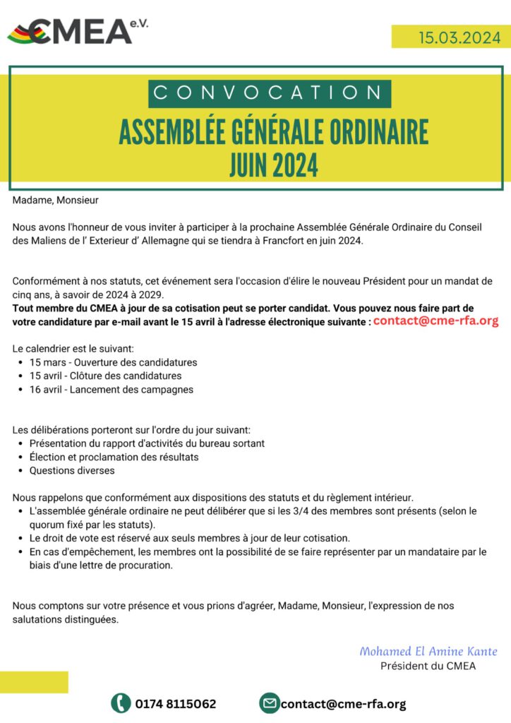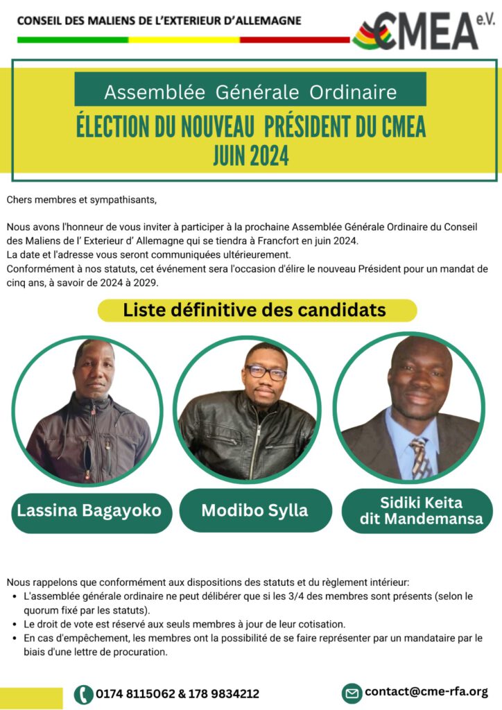 Chers membres du bureau, chers Compatriotes, nous sommes heureux de vous informer que la liste définitive des candidats pour l’élection du nouveau président du CMEA e.V. en juin 2024 a été établie. Voici les candidats : Lassina Bagayoko Modibo Sylla Sidiki Keita dit Mandemansa Nous avons une sélection diversifiée de candidats, chacun apportant ses propres […]