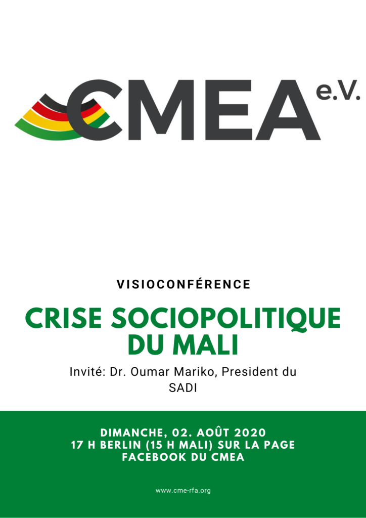 Theme: la crise sociopolitique du Mali Quand? Demain Dimanche, le 02 Août 2020 Où? sur notre page facebook CMEA . Invité: Dr. Oumar Mariko, president du SADI