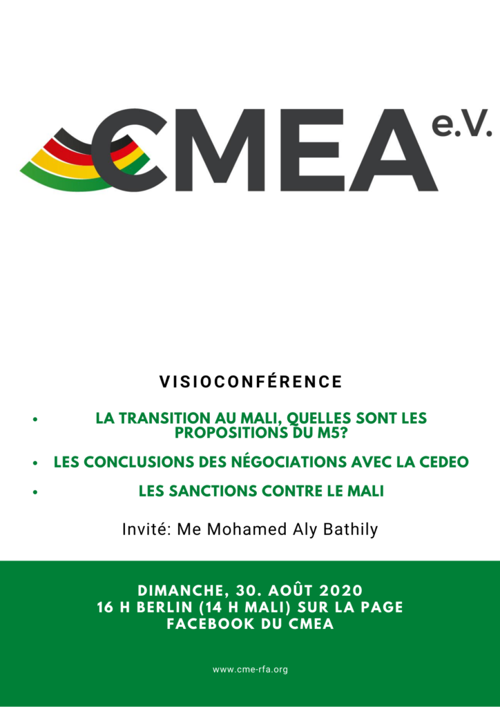 Theme: la transition au Mali, Quelles sont les Propositions du M5? les conclusions des négociations avec la CEDEAO les sanctions contre le Mali Quand? Dimanche, le 30 Août 2020 à 16H Où? sur notre page facebook CMEA . Invité: Me Mohamed Aly Bathily